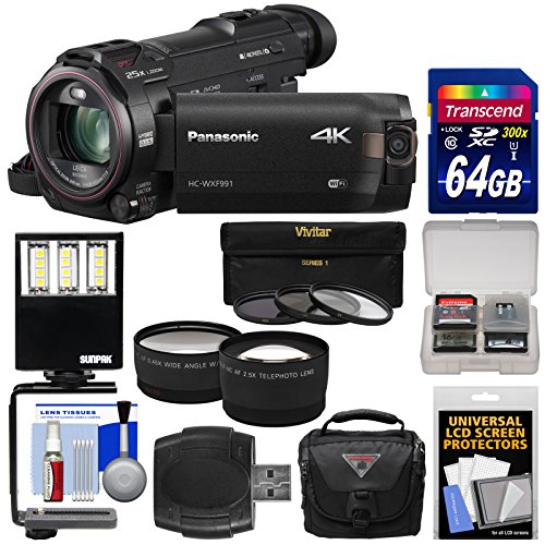 Panasonic HC-WXF991 Wi-Fi 4K Ultra HD Video Camera Camcorder with 64GB Card + Case + LED Light + 3 Filters + Tele/Wide Lens Kit