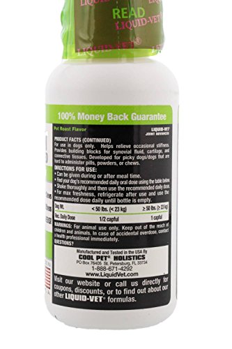 -. Binding : Misc. -. Brand : Liquid-Vet by COOL PET Holistics -. Feature : Easier than pills or chews / Helps relieve occasional stiffness / Supports your pet's flexibility and mobility / Contains fast acting Glucosamine / Delicious chicken flavor -. Label : Liquid-Vet by COOL PET Holistics -. Manufacturer : Liquid-Vet by COOL PET Holistics -. MPN : TC-PR-C -. PackageQuantity : 1 -. PartNumber : TC-PR-C -. ProductGroup : Pet Products -. ProductTypeName : PET_SUPPLIES -. Publisher : Liquid-Vet by COOL PET Holistics -. Studio : Liquid-Vet by COOL PET Holistics -. Title : Liquid-Vet Dog Joint Formula - Fast Acting Glucosamine for Joint Aid in Canines - Trial Size, Buy 1 Get 1 Free - 8 Fluid Ounces