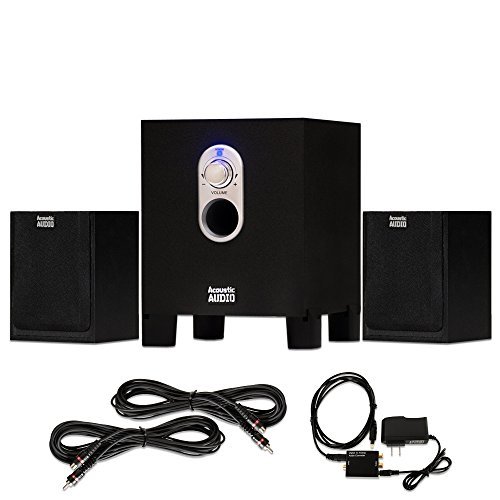 -. Feature : Acoustic Audio AA2101 computer, gaming, multimedia 2.1 speaker system, 250 watts system power, 40Hz-20 kHz frequency response, integrated audio amplifier / Enhanced bass boost design, front panel volume control, plug and play connections, computerized enclosure design, magnetically shielded speakers, subwoofer speaker is 6.25" x 6.75" x 8.5", rear sub volume control knob / Ported for fuller bass, 2 full range satellite speakers are 3.75" x 3" x 4.75", satellite speakers have 6' single RCA cables, 3.5mm Aux to RCA wire and user manual included / 110V required power supply, designed and engineered in the USA, AADAC digital optical converter and two 25 foot RCA extension cables included / Use for home entertainment system, laptop or PC, DVD, gaming, MP3 player, smartphones, tablet or any devices with a 3.5mm headphone output or RCA audio output, this listing and P.R.Ice is for 1 complete speaker system, 1 AADAC converter and 2 RCA extension cables
