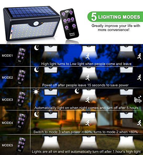 5 Modes Under The Remote Control• Motion sensor+low light mode/ Motion sensor mode(power saving mode)/ Always lighting mode/ Automatic mode/ Emergency light mode.