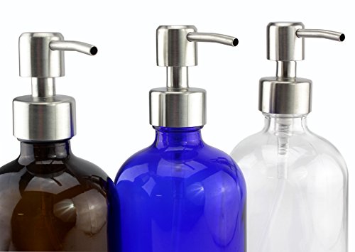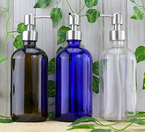 16oz Glass Bottles w/ Stainless Steel Pump Dispensers - Three Pack Bundle (1 Cobalt Blue, 1 Amber, 1 Clear); Boston Round; Includes Lids for Storage