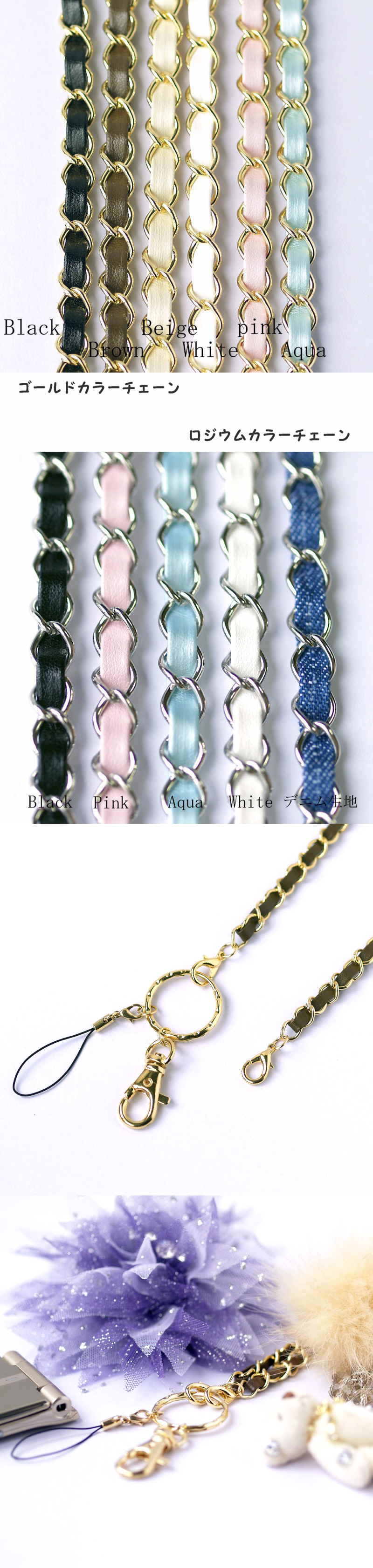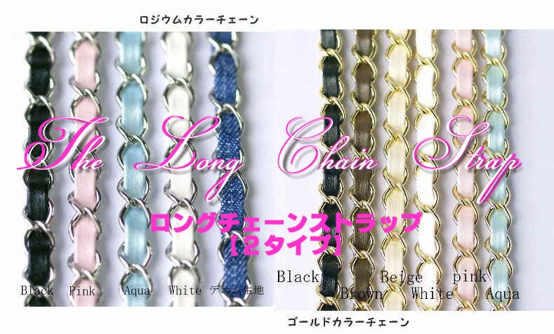 | カラー | ■ゴールド色チェーン (ブラック・ブラウン・ベージュ・ホワイト・ピンク・アクア) ■ロジウム色チェーン (ブラック・ピンク・アクア・ホワイト・デニム生地) |