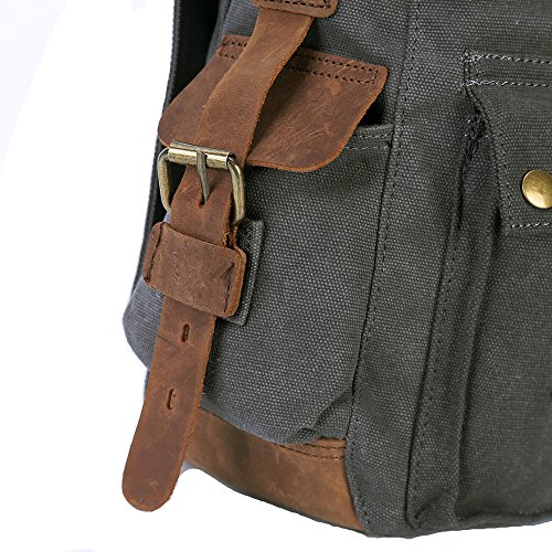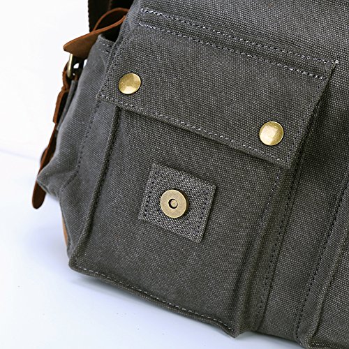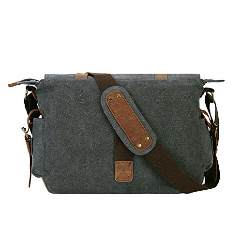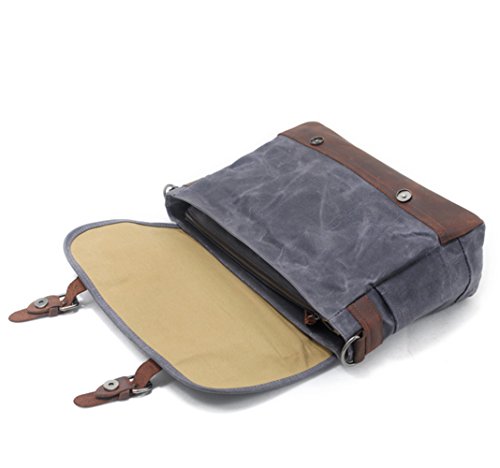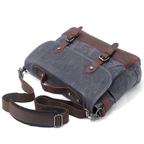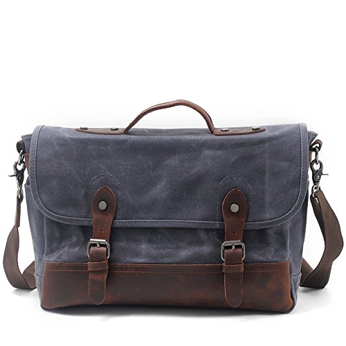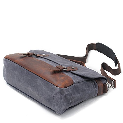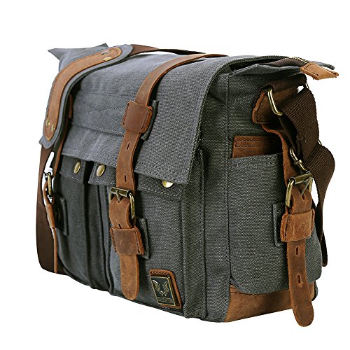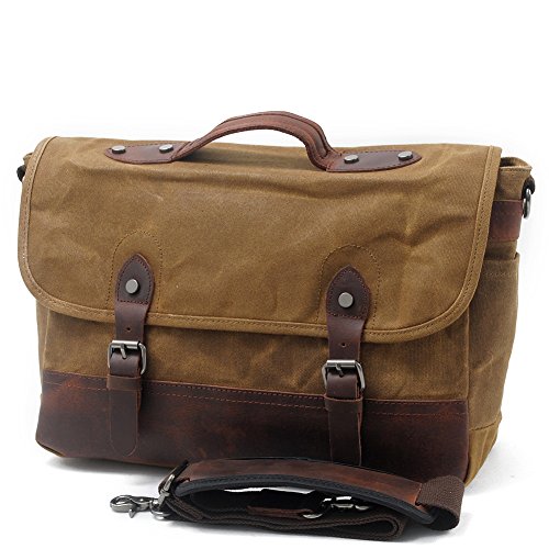 Product Description It's tough, yet classy rugged looking at the same time and has a very earthy quality to it. Canvas construction with 'crazy horse leather' (oil permeated leather for waterproofing) reinforced bottom corners and side straps, this bag has just about everything you need in a small-to-medium size messenger bag... including a wide, comfortable shoulder strap. This interior of this bag is nicely lined to protect your items from bumps and bruise, and it has several pockets: * The main interior cavity is about 15 inches wide, 10 inches deep and expands to about 5 inches thick. * Interior: One zippered 4 x 8 inch pocket * Exterior front: Two snap-closed 6.5 x 4 inch pockets * Exterior sides: One slip-in, strap-secured 4.5 x 4 pocket on each side As mentioned, the shoulder strap is comfortable and adjusts to fit just about any size person; the strap has canvas leather reinforcement at its center wear area. The leather straps that hold the top flap closed may either be used as buckled straps, or they have magnetic snap-closures underneath that can be used instead. Your choice. The interior, with its nice size area, can hold tablets, netbooks, other small devices and personal items without any difficulty at all. The zippers seem to be medium to heavy-duty. 0