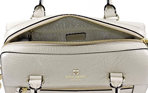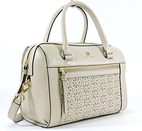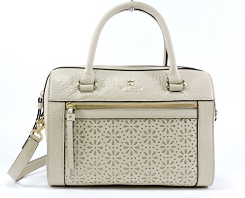 Kate Spade's Peri Lane Bubbles Delaney is wrapped in beige tone pebbled cowhide leather with 14-karat light gold plated hardware. Kate Spade's color-way is "Cremadevie". The front is accented with a panel of laser cut flower pattern over a lined zippered pocket. Kate Spade's logo accents the upper front edge and there is top stitch detailing throughout. The interior is custom cream tone Capital Kate logo print fabric. It features a zippered pocket and two open slip pockets. It has a fully zippered top closure with a long leather pull. There are dual rolled leather handles with a drop of 4.5 inches, or you can use the removable leather shoulder and cross-body strap with a 19 inch drop. The overall measurements are approximately 10.5 inches (L) x 8 inches (H) x 5.5 inches (W).Feature