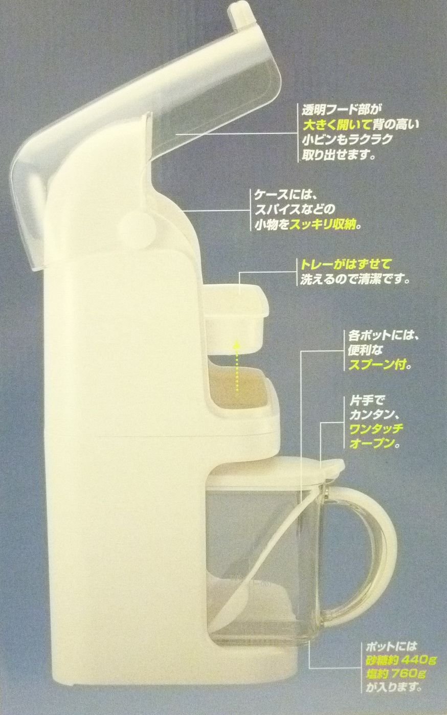 ● Seasoning pot capacity: 640ml × 3 ● Size: width 223 × depth 191 × height 350 mm ● Material: main body · hood · tray / polystyrene handle · anti-slip / EVA resin stopper / polypropylene stocker · possession / polystyrene spoon ·