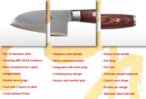 This super sharp VG-10 Japanese stainless steel knife is clad with 2 layers of low carbon steel outside. This design could increase toughness, improve stain resistance, and prolong knife life. The perfect weight balanced full length handle is made of Pakkawood which is durable, non-slip, easy to clean, waterproof, bacteria-resist, comfortable, and beautiful. Mirror polished stainless steel bolster and butt end design are made this knife even better. Every Zhen Premium knife comes with its own hand crafted gift box or storage box. DON'T chop bone or use knife on hard surface like glass cutting board, tile, and granite. Hand-wash your blades with gentle dish soap, rinse clean and towel dry immediately to prevent rust (no dish washer). Hone your blades with a steel or ceramic rod weekly to keep it sharp. Recommend to sharpen your blades with a whetstone at an angle of 15 degrees. 100% satisfaction guarantee.
