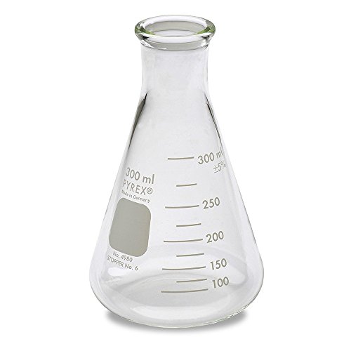 Corning 4980-300 PYREX Narrow Mouth Erlenmeyer Flask with Heavy Duty Rim, 100 mL capacity-300 mL capacity Graduation Range, Rubber Stopper Number 6, 89 mm Diameter