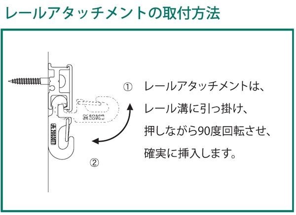 別売の『アールクレール 10kgタイプ(CRE)』専用のフック型レールアタッチメントです。ループワイヤー(別売)を引っ掛けて、10kg以内でご使用下さい。外れ防止付きです。 |