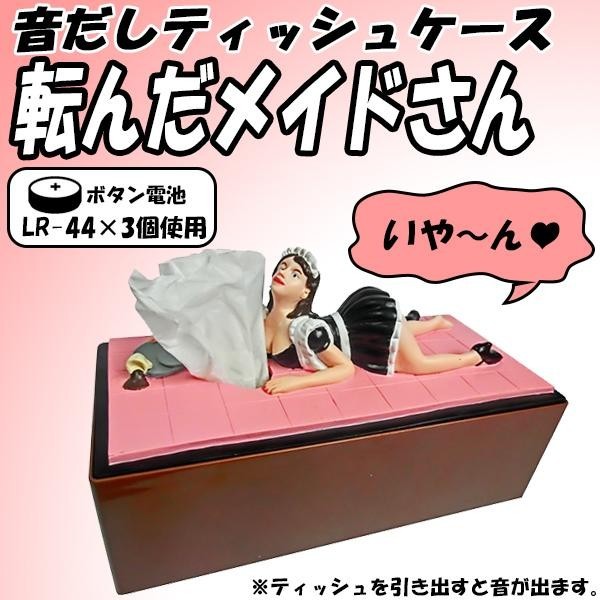 | ティッシュを引き出すと「いや~ん」と音がでる、転んだメイドさんが付いたケースです。市販のティッシュをセットしてお使い下さい。 |