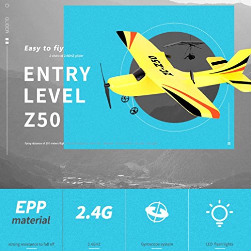 Studio : Sacow Publisher : Sacow Product Description Z50 2.4G 2CH Gyro RTF Remote Control Glider 350mm Wingspan EPP Micro Indoor RC Airplane Description: It's made with very light and durable material--EPP. It is very durable and can survive many With super tough EPP special foam material, the aircraft is flexible and resistant to fall. crashes. The glider is light, and can fly longer than normal indoor RC toys, that's because it takes less energy to support the plane body. No need to know too much about aerobatic theory and you can make a perfect aerobatic flight! Powerful motors make the model could take off from the ground easily. Easy for a beginner to operate because it is lightweight yet has a sturdy construction. Specifications: Name: RC Airplane Model: Z50 Material: Durable EPP Remote controller: 2.4G 2CH Flying time: about 20min Charging time: about 60min Remote control distance: about 100m Airplane battery: 3.7V 300mAh Lipo battery Battery size: 3.5 * 2 * 0.7cm Transmitter battery: 3 * AA battery (not included) Wingspan: 350mm / 13.7in Length: 294mm / 11.5in Height: 133mm / 5.23in Item weight: about 31g / 1.09oz(including battery) Package information: Package size: 42 * 31.5 * 8.3cm / 16.53 * 12.4 * 3.26in Package weight: 424g / 14.9oz Gift box package Package contents: 1 * RC Airplane 1 * 3.7V 300mAh Lipo Battery(built-in) 1 * Remote Controller 1 * Pair of Propeller 1 * USB Charger 1 * Landing Gear 1 * English Manual
