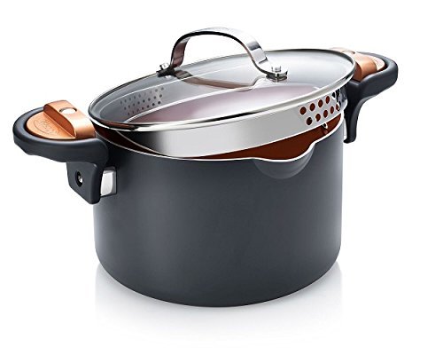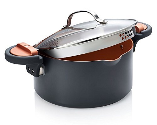 When it's time to strain, it can be such a pain. You splash and spill your pasta everywhere. Not anymore! introducing the Gotham Steel non stick pasta pot - the revolutionary pasta pot! Gotham Steel pasta pot is the revolutionary, 5-quart or 4 quart pasta pot complete with a lock-on lid that doubles as a smart strainer. The tempered glass lid has large holes on one side for draining larger foods like potatoes and ravioli, and small holes on the other for smaller foods like spaghetti and vegetables. Just lift and lock and you'll get a steady pour like never before! it's that easy! plus, with the Gotham Steel copper-infused, scratch-resistant surface, you can boil and mash potatoes in the same pot! even cheesy chili mac is no match for the Gotham Steel pasta pot's non-stick surface.Feature