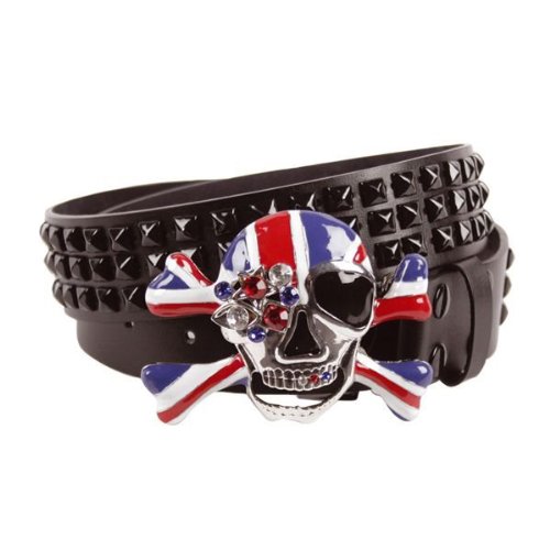 -. Binding : Apparel -. Brand : Queen of Darkness -. Color : Black -. Department : unisex-adult -. Feature : Enamel & Jeweled Union Jack Skull & Crossbones / 3 rows of black pyramid studs / Medium size 35" to 39" meant to be worn low on the waist. / Large size 42" to 46" meant to be worn low on the waist. -. Model : ABE-256-07 -. ProductGroup : Apparel -. ProductTypeName : ACCESSORY -. Title : Queen of Darkness Union Jack Jeweled Skull and Crossbones Black Studded Belt