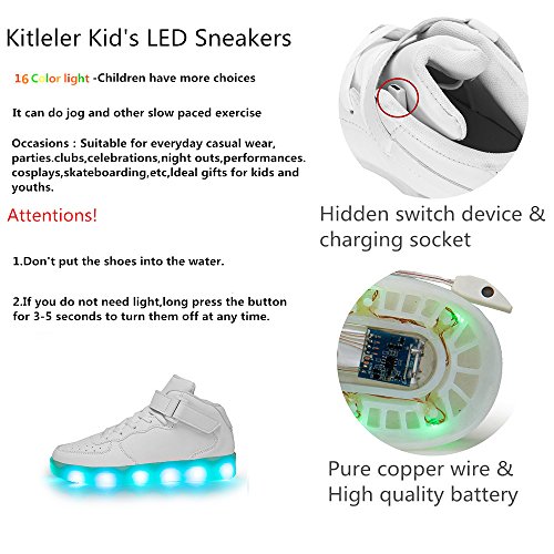 -. Feature : It can protect children's safety in the evening: make the children conspicuous at night, vehicles or pedestrians, or skateboard enthusiasts can find it in time, and then avoid the children. / The More Durable: The sole adopts the latest high tenacity and pure copper wire which is hard to break to connect the LED lamp. It abandons the old broken light strip. The sole can be bent without damaging the LED light so that you can run with ease. / Charge Instruction: You can connect a USB cable from the computer, you can also use mobile phones and other chargers, mobile power can also be used. Switch on the shoes when received and light up until all power gone.Then charge both shoes for 3 hours. Which can provide 8~11 hours of lighting time. / Occasions:Suitable for everyday casual wear, parties, clubs, celebrations, night outs performances, cosplays, skateboarding, etc, ldeal gifts for kids and youths. / Kitleler is a professional brand of high quality light shoes. If you have any problems with the light shoes, please contact us and we will send you the goods free of charge.