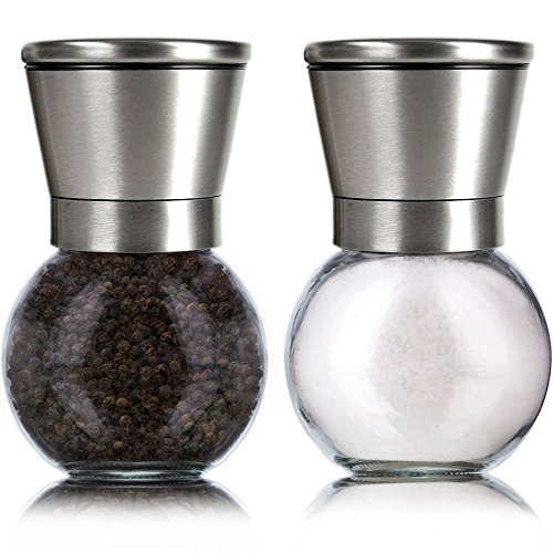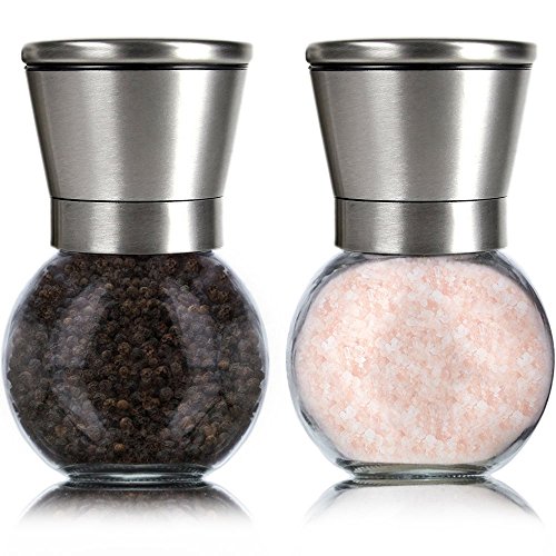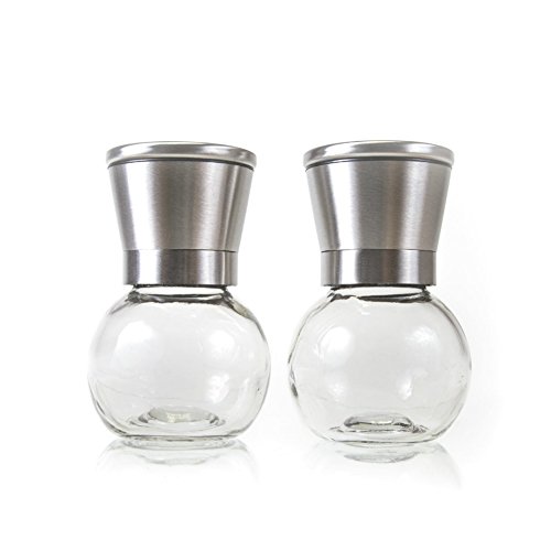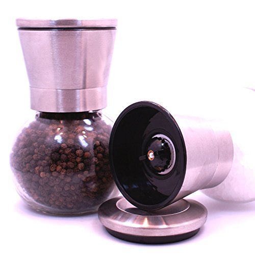 Happylife Brushed Stainless Steel Salt Mill and Pepper Grinder Set With Round Glass Body and Adjustable Ceramic Rotor