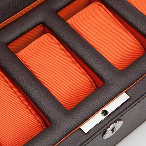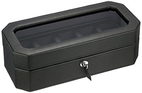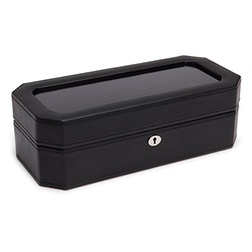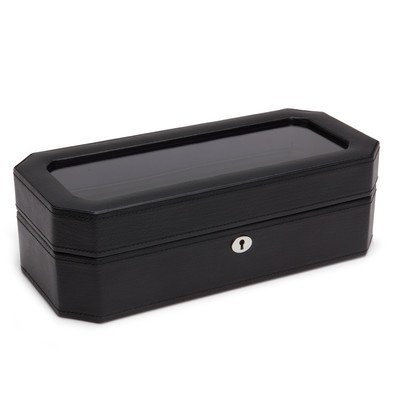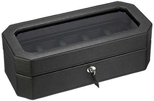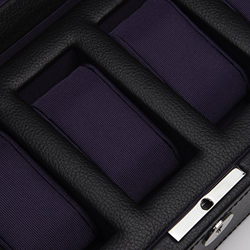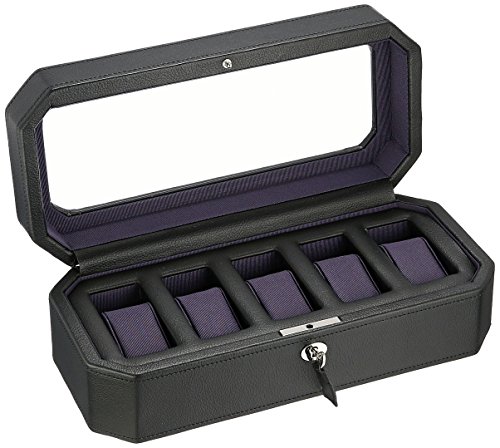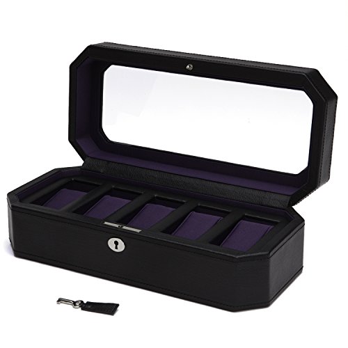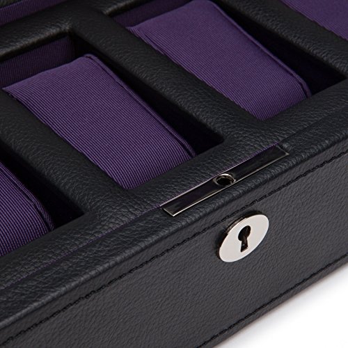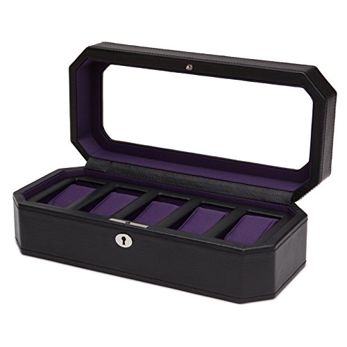 Product DescriptionA mid-century inspired watch box, the Windsor combines sharp colors with smooth edges. Includes chrome finished hardware, locking glass cover, black pebble faux leather, purple textured silk lining and 5 piece watch storage.0