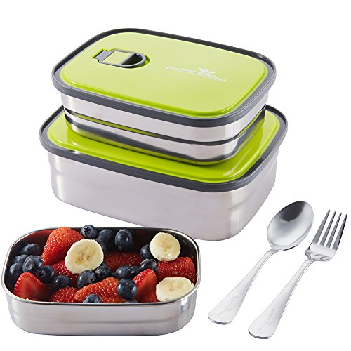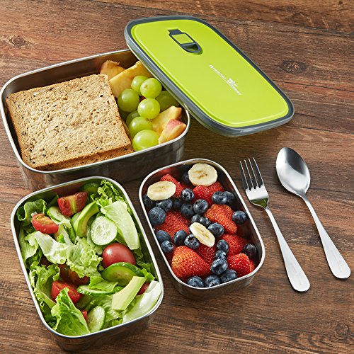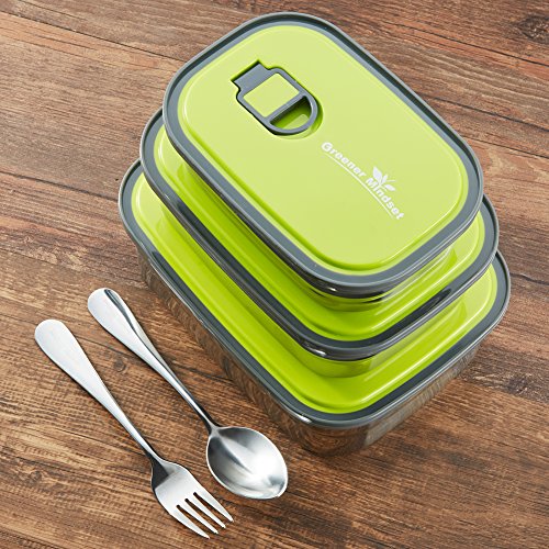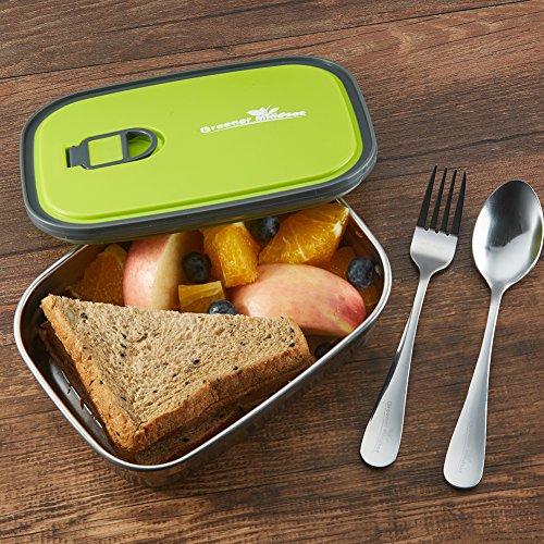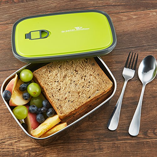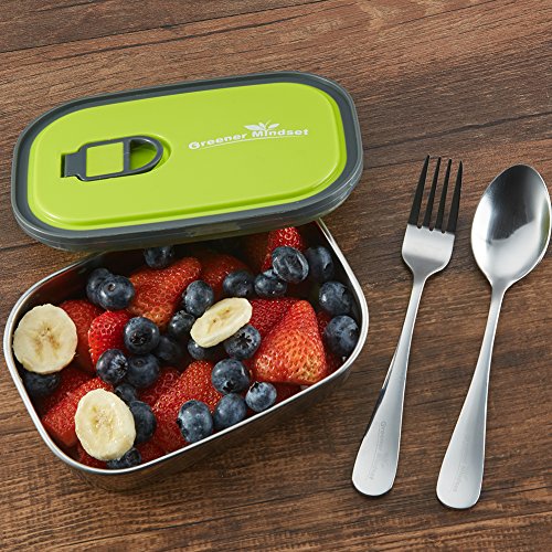 Greener Mindset Stainless Steel Bento Lunch Box | Leak Proof 3 in 1 Food Container Storage Set + BONUS Fork & Spoon Set | LIFE-TIME WARRANTY| For Adults & Kids | Eco Friendly Healthy & BPA Free| GREEN