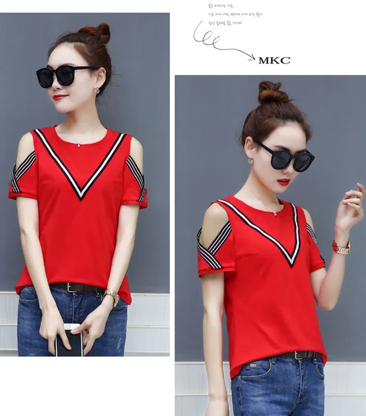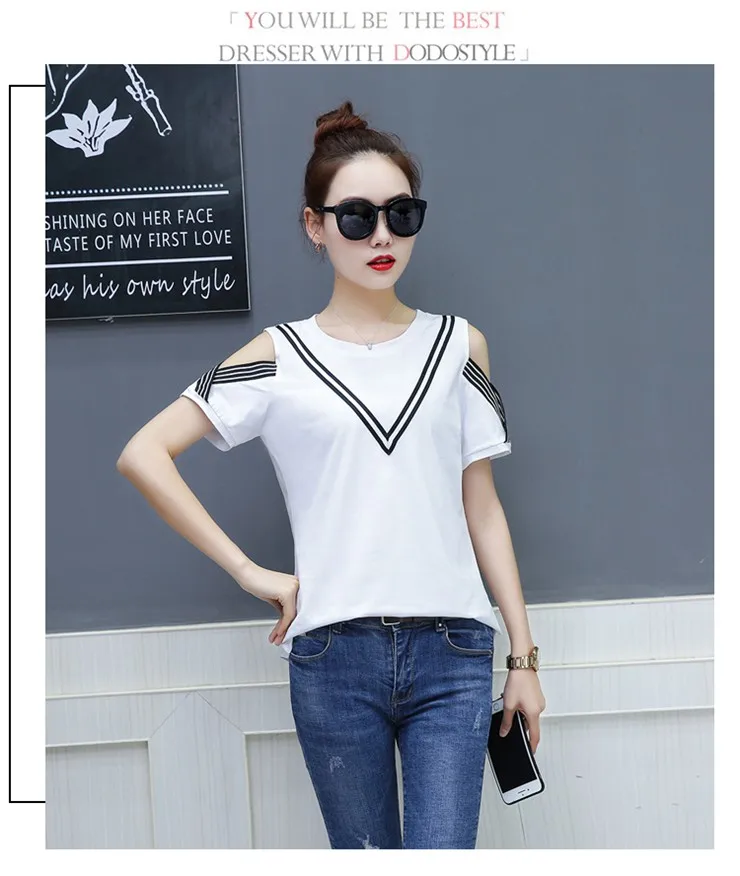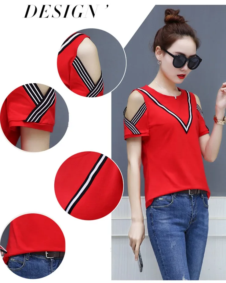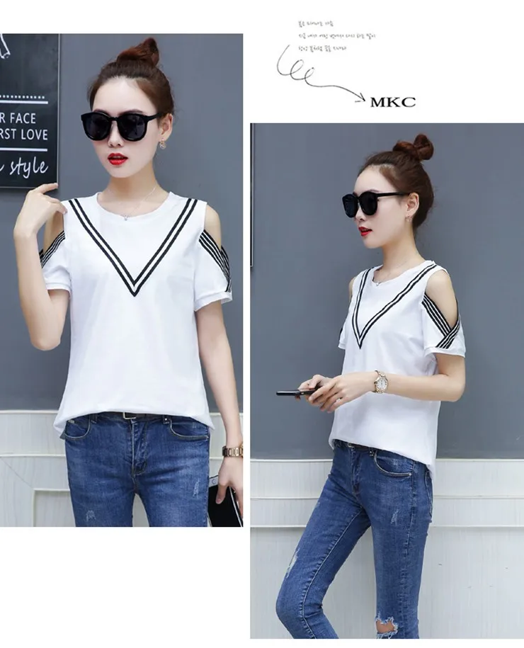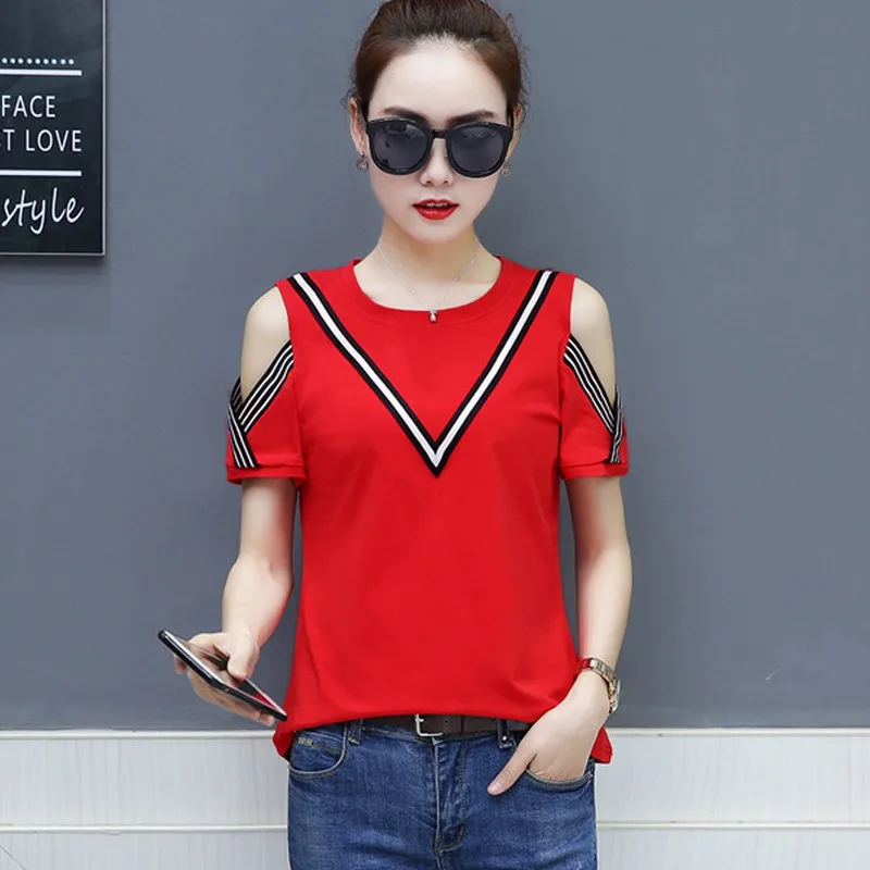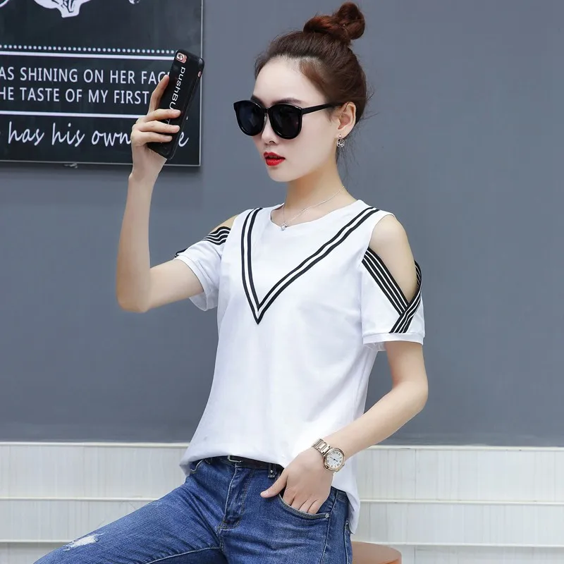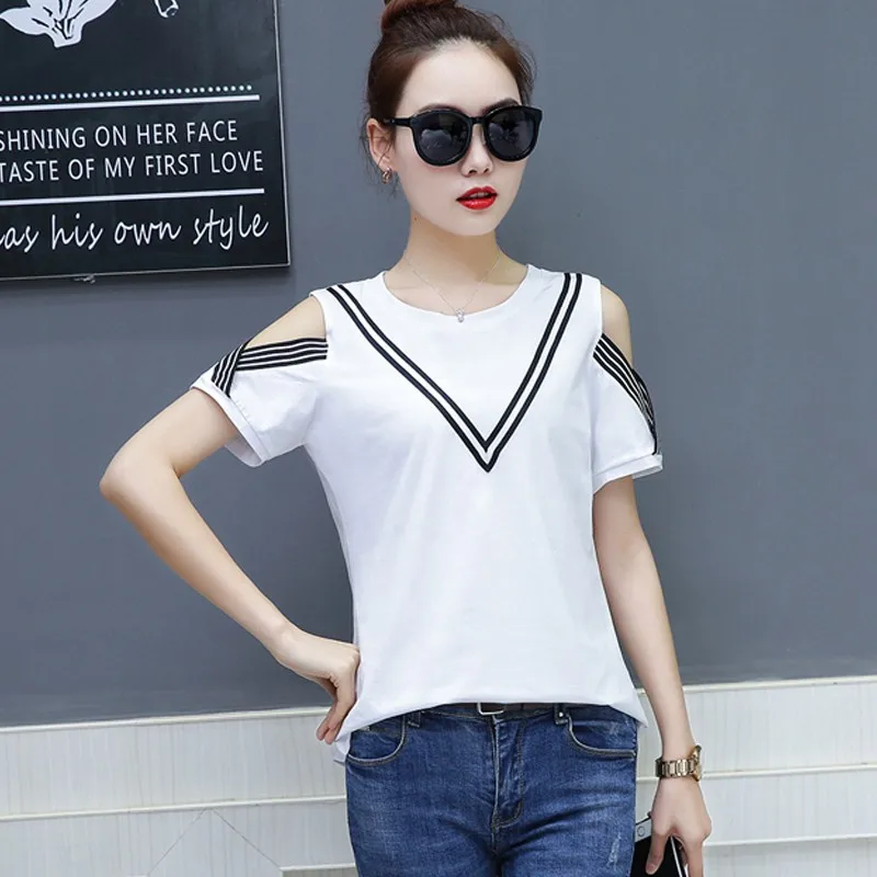 Cotton T-shirt :Short Sleeve Open Shoulder Tshirts Femininas Poleras Mujer