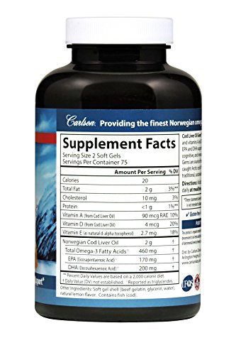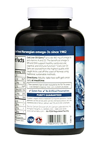 Each serving of Carlson Cod Liver Oil Gems provides 460 mg of omega-3s, which support heart, brain, and immune health. Cod Liver Oil Gems have a delicious light lemon flavor, so they can be chewed or swallowed. To ensure maximum freshness, our omega-3s are closely managed from sea to store.