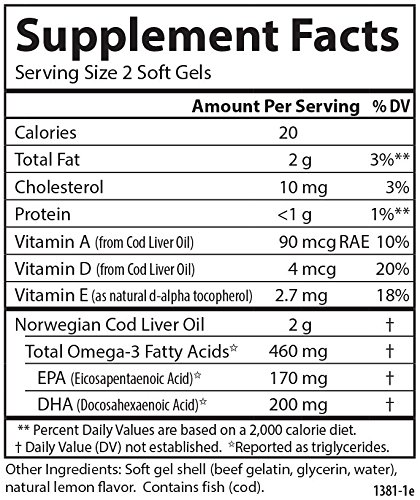 460 MG OMEGA-3S: A single serving of our lightly lemon flavored soft gels provides 460 mg of omega-3s. Vitamins A and D3 are also found in Cod Liver Oil.