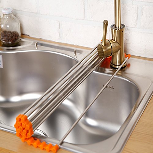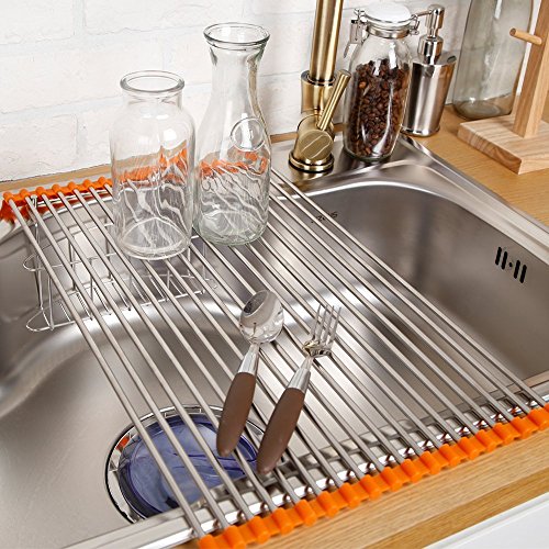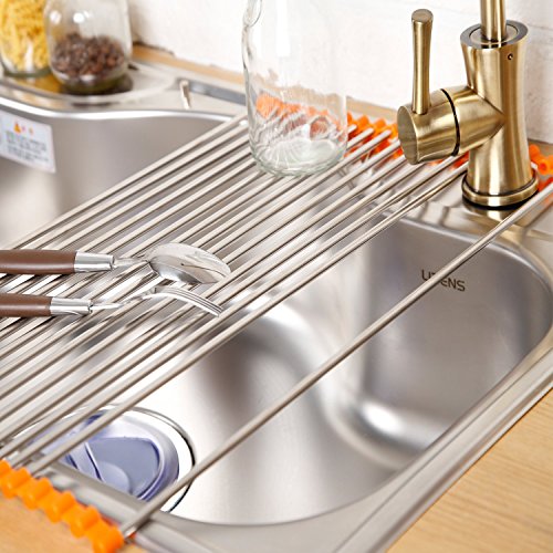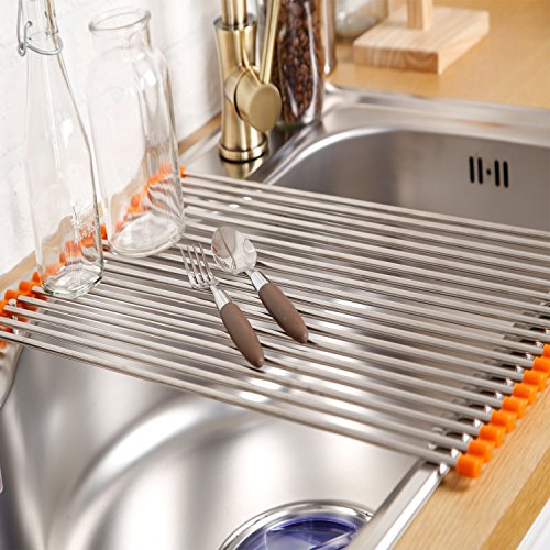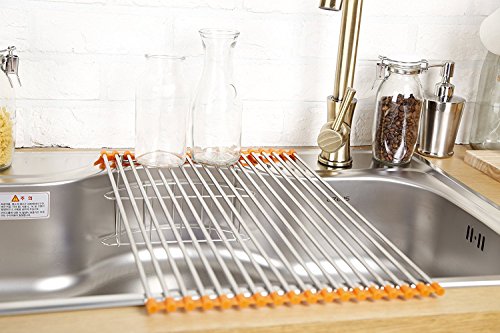 - ★we take pride in the high quality of our stainless steel rollup dish drying rack. It's much wider than competing products, meaning that it will easily fit atop your sink, providing a lot of space for drying dishes and defrosting foods★we take pride in the high quality of our stainless steel rollup dish drying rack. It's much wider than competing products, meaning that it will easily fit atop your sink, providing a lot of space for drying dishes and defrosting foods