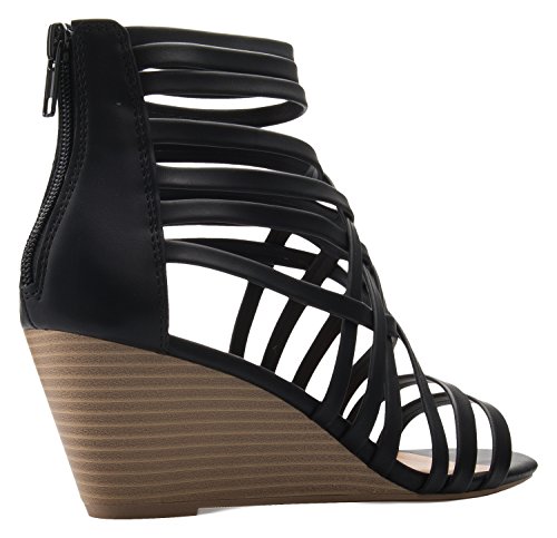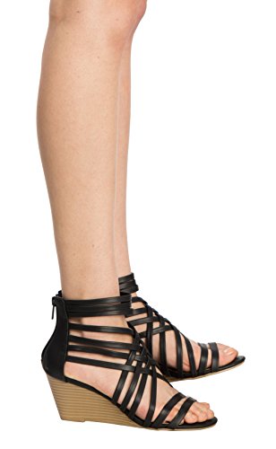 Product Description These strappy wedge heels will be your new go-to pair! Cutout sandals are made out of vegan leather with a zip closure at the ankle and a stacked wedge heel for maximum support. 0