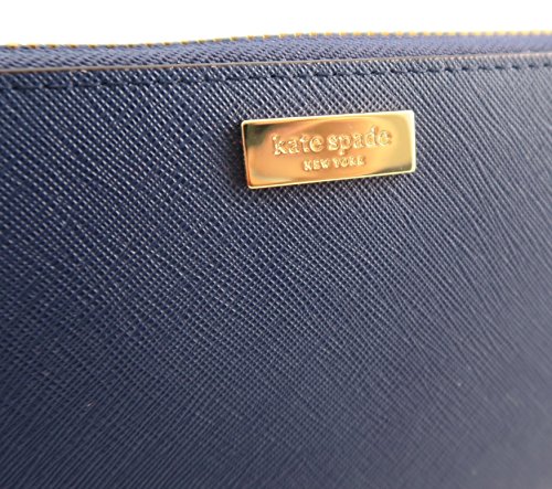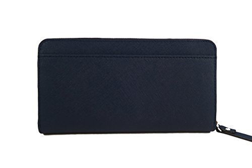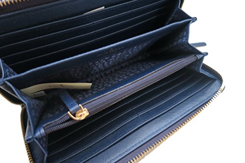 Wrapped in french navy blue saffiano leather with light gold plated hardware. This zip around style wallet is accented with the Kate Spade staple nameplate on the front, and features a full length slip pocket on the back. The interior is saffiano leather and fabric and features a center zippered compartment, 12 credit card slots and full length bill compartments. It measures approximately 8" (L) x 4 1/4" (H) x 1" (W).Feature