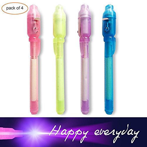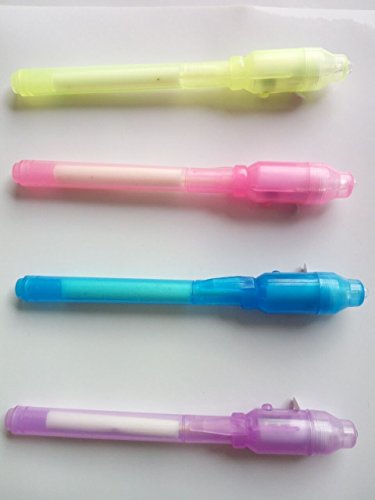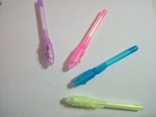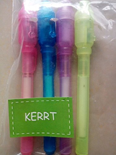 KERRT 8pcs Secret Message Invisible Ink Pen with Black Light Kids Have Fun Children can write anywhere and you can't see it until they shine the pens light over where they wrote. They will think they are secret agents with these pens. Fun for sure and they can play with these all day long! Multiple Purposes You can use these invisible pens on many different things and create a lot of fun, such as encrypting the wedding invitations, identifying your personal valuables or even using the UV light to check dollar bills. Built-in UV Light It is a great idea to have the UV light installed in the cap so you do not need to buy a spare light. It comes everything in it so your children and their friends can instanly play with these and see the seceret messages they write!Feature