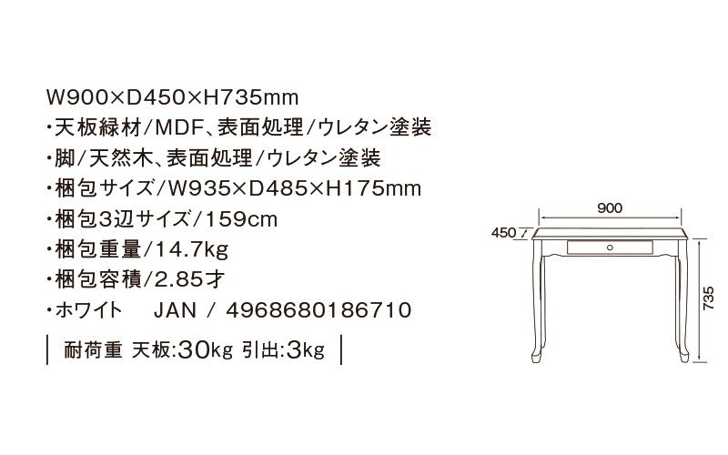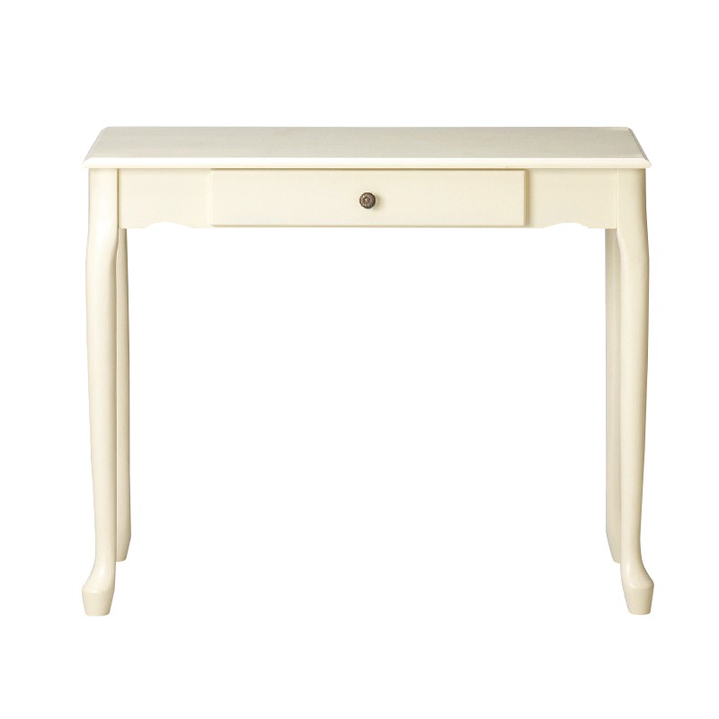◆商品説明◆女性の憧れ、姫系スタイルにぴったりのアンティーク調デスクシリーズ・クレモント☆エレガントな雰囲気に加え、かわいい猫脚デザインが大人ガーリーな印象を与えてくれます☆かわいい家具に囲まれた、幸せな毎日を暮らしましょう♪【サイズ】本体:幅90×奥行45×高さ73.5cm【材質】天板:MDF、ラッカー塗装脚部:天然木、ラッカー塗装【商品仕様】色:アイボリー引き出し付き耐荷重:天板30kg、引出3kgお客様組立品[組立の目安:約30分]◆注意事項◆白家具は長期間直射日光に当て過ぎると白が少しずつ黄変する恐れがありますので、高温多湿,直射日光を避けてご使用下さい。【こちらの商品はメーカー直送品です】※代引きでのお支払い不可※ご指定日受付不可とさせて頂きます。※在庫ありの場合は5日ほどで発送になります※在庫切れの場合いご連絡させていただきます※同シリーズ以外の商品との同梱はできません。ご了承ください北海道、九州への発送は別途500円加算になりますご了承ください