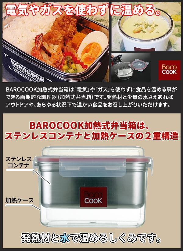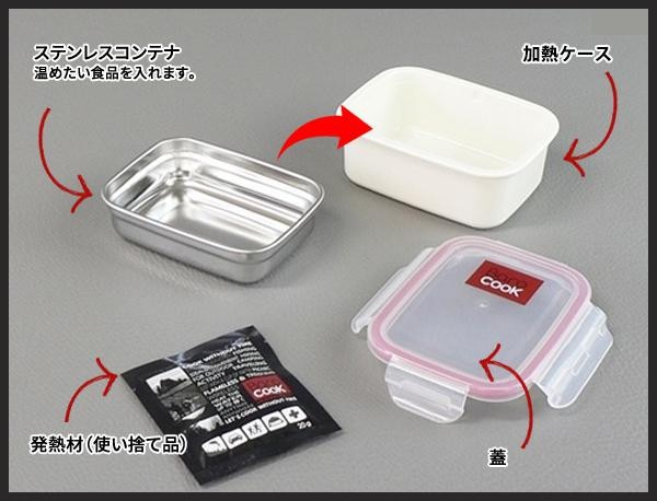 ステンレスコンテナと加熱ケースとの2重底構造になっており、加熱ケースに発熱材と少量の水を入れる事で反応して蒸気を発生させ、いつでもどこでも温かい食べ物が楽しめます。電気が使用できない場合でも使用可能なので、防災・緊急時・アウトドアなどにおすすめです。 |