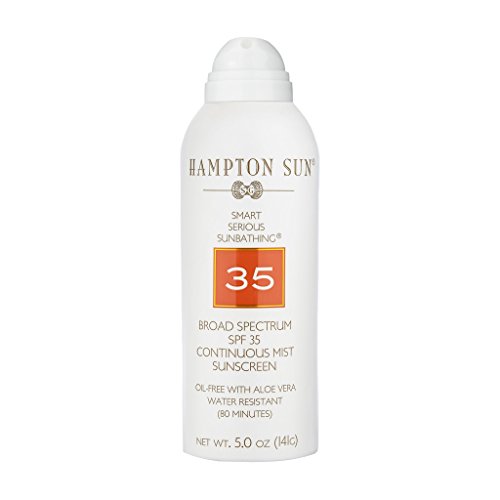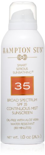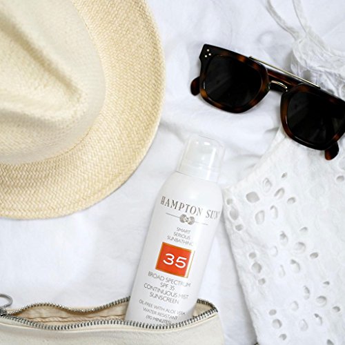 Hampton Sun's SPF 35 Continuous Mist Sunscreen offers the highest quality of sun protection in a unique, oil-free formula. The revolutionary formula has advanced ingredients including Polycrylene, that increase the product's water resistance and filters more UVA rays than the average sunscreen to protect skin from the sun's harmful rays during any activity – from sophisticated sunbathing to high-powered athletics. Aloe vera and a multi-vitamin complex nourish and hydrate skin while the UVA/UVB broad spectrum sunscreens protect. SPF 35 Continuous Mist has a light, silky feel that absorbs instantly with no sticky film and has a hint of Hampton Sun's signature Privet Bloom scent for the perfect touch of sophistication. This product offers powerful protection – The non-aerosol 360º dispenser sprays at any angle for complete, even sun coverage without damaging the environment. Without the need for chemical propellants, what is dispensed onto your skin is pure product. Hypoallergenic and dermatologist tested to be used by all skin types.Feature