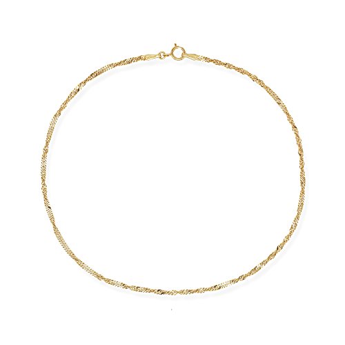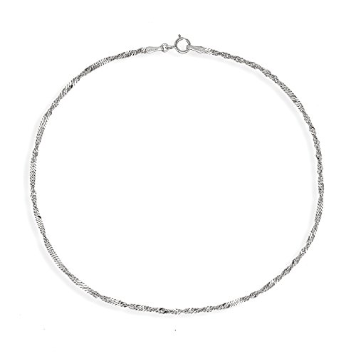 This sparkling solid 10-karat Singapore anklet is available in a choice of white or yellow gold. The piece measures 1.7 mm wide and 10 inches long with a spring ring closure.