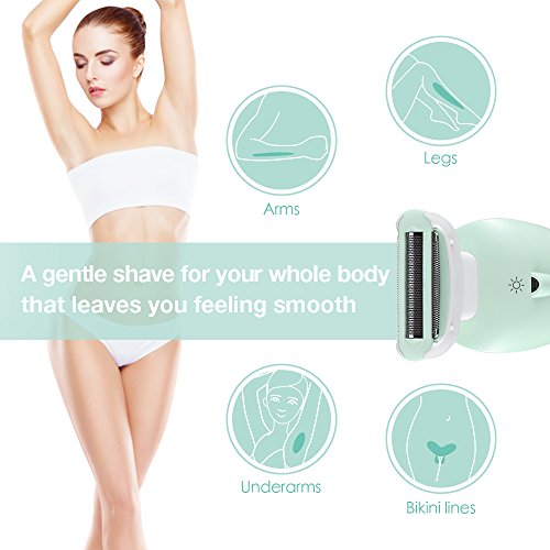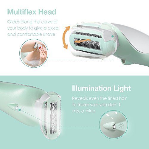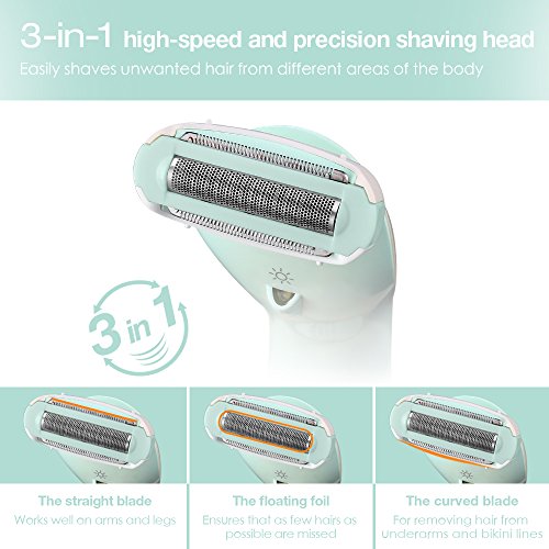 3-IN-1 HIGH-SPEED AND SHARP SHAVING HEAD: The straight blade works well on arms and legs; the curved blade is effective at removing hair from hard-to-reach areas such as underarms and bikini lines; the floating foil ensures a close but safe shave