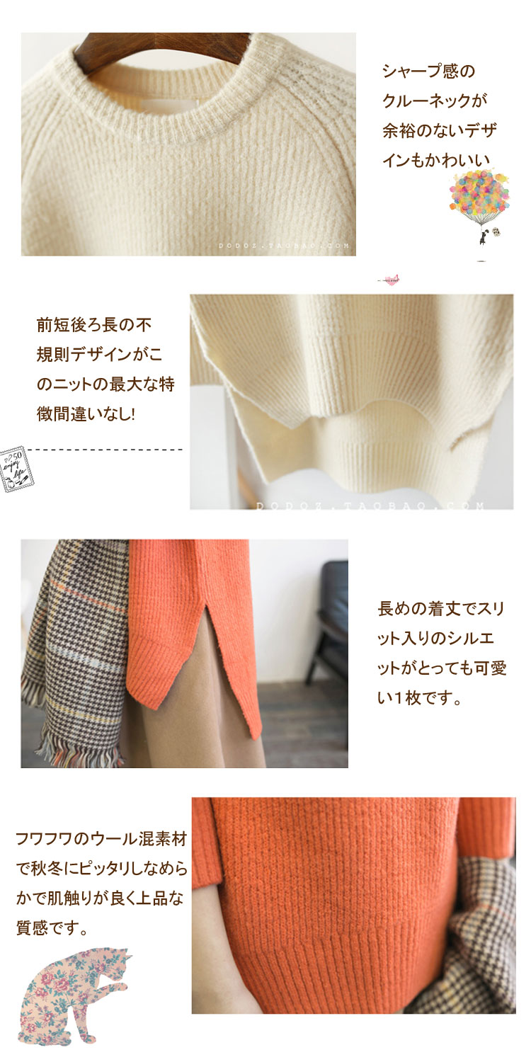 | ゆったりシルエットが激かわ?ざっくり編みの万能長袖ニット着心地、可愛さ、着まわし力、しっかりと考え抜かれた大好評アイテム。前短後ろ長の不規則デザインがこのニットの最大な特徴間違いなし!オーバーサイズのふんわりとしたシルエットでCuteなルックスに☆ロング丈とゆるめのシルエットがこだわり使いやすさとかわいいカタチはそのままに、フワフワのウール混素材で秋冬にピッタリしなめらかで肌触りが良く上品な質感です。長めの着丈でスリット入りのシルエットがとっても可愛い1枚です。パンツでもスカートでもデイリー使いにピッタリのオススメアイテムです。 | |