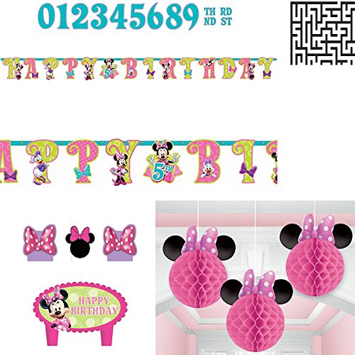 Minnie Mouse Jumbo Add - An - Age Letter Banner, Hanging Honeycomb Decorations and 4 Piece Molded Cake Candle Birthday Decoration Bundle - Includes 1 Maze Game Activity Card by ClassicVariety