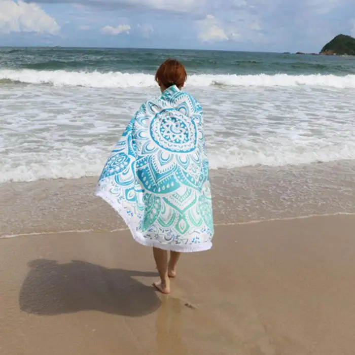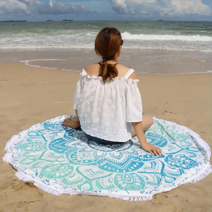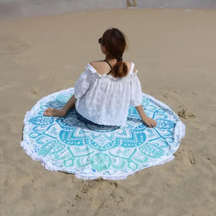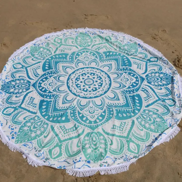 Summer Microfiber Beach Towel Round Tassel Decor Lotus Flowers Pattern 145cm Circular