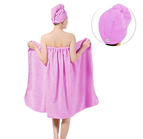 - HIGH GRADE MATERIAL: Microfiber is also a high-tech textile raw materials,which is safe to your skin and also eco-friendly.The bending stiffness is very small due to the small diameter,so the fiber would make you feel very soft and smooth.High quality fabric is durable and not easy to fade.Bath wrap towel size approx 35.4* 59.1 inch,and drying cap approx 9.1 * 25.6inch,which can best meet your needs.