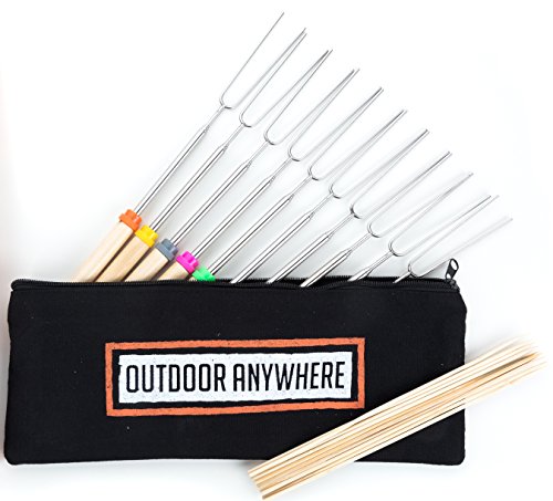 BONUS ITEMS - Smore kit also comes with a set of 10 wooden bamboo marshmallow sticks, which easily double as shish kabob skewers, and a canvas carrying case to store and transport the camping fork set