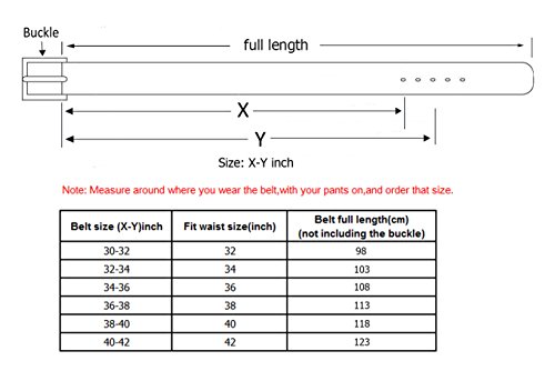 -. Feature : Leather: 1.5inch wide; Buckle: 1.97inch wide, 2.36inch long.(1.0inch=2.54cm) / If your waist size is 34, please choose our size:32-34inch. If your waist size is 36, please choose our size:34-36inch. Size reference: belt size(inch)--full length(cm),30-32inch--98cm;32-34inch--103cm;34-36inch--108cm;36-38inch--113cm;38-40inch--118cm;40-42inch--123cm. Belt full length measuring from head to the tail of the belt strap. (not including the belt buckle) / The Buckle is fixed with screws. If it is too long, you could unscrew it and then cut the leather. / High quality leather belt. Excellent Craftsmanship, super-comfortable to wear. / Good packaging and service.
