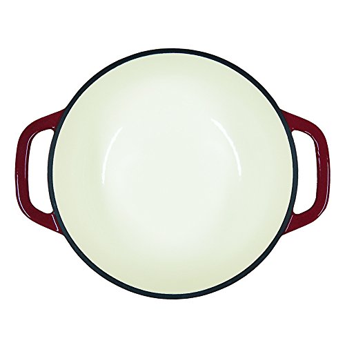 -. Feature : Heavy enameled cast iron lid with stainless steel knob.2 Coats of durable porcelain enamel in colorful exterior,cream-colored interior.11" diameter,4.7" deep. / Enameled cast iron Dutch oven is perfect for braising and other methods that require long cooking over low heat.Its generous size provides ample cooking space,and can be used easily on the stove,in the oven and as a serving dish on the table. / The cast iron vessel has superior heat distribution and retention.Self-basting condensation ridges allows for more flavorful stews.The black rim on the pot is matte porcelain,not exposed cast iron. / Solid heavy-gauge cast-iron construction is extremely durable.The porcelain enameled finish is beautiful,long-lasting and eliminates the need to season the cookware. / Sturdy handles leave ample room for convenient hanging when not in use.And the up angle design make it more comfortable to grasp.