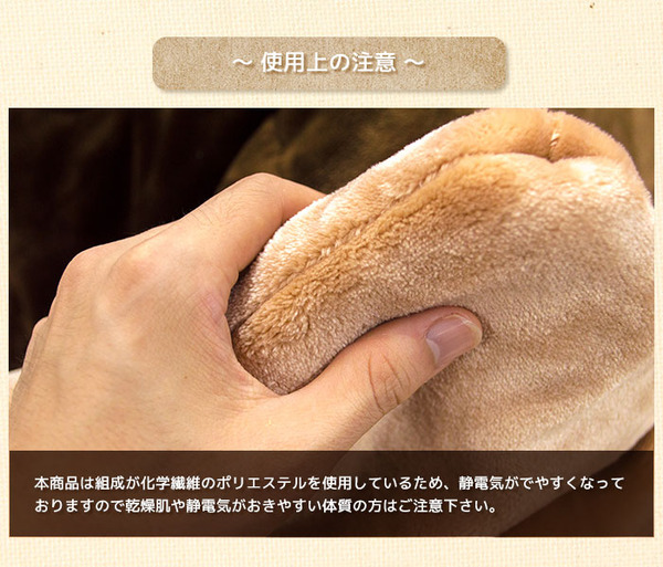 注意点:組成が化学繊維のポリエステルを多く占めているため静電気が発生しやすい仕様となっております。
