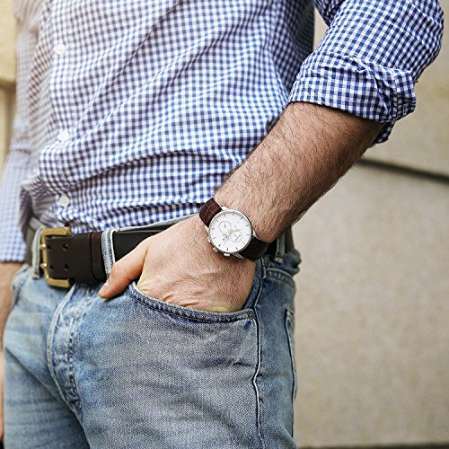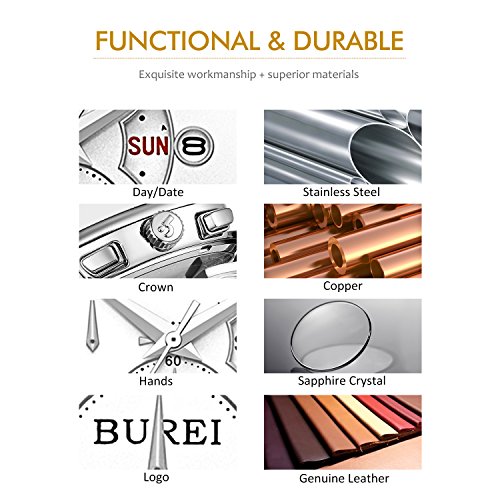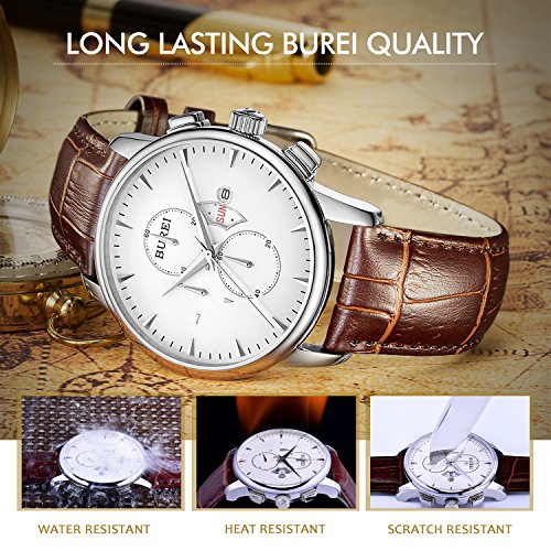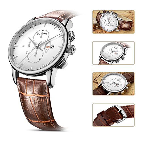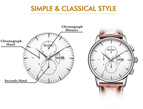 BUREI Business Casual Mens Wrist Watches with Date Day Chronograph Stopwatch with Brown Leather Str