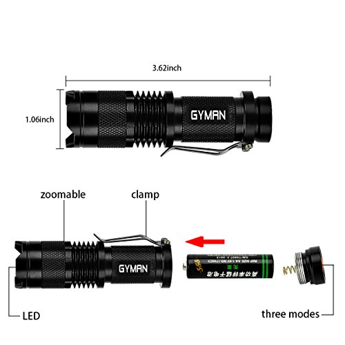 Studio : GYMAN Publisher : GYMAN Binding : Tools Home Improvement Product Description This flashlight is designed by durable materials, being in small size, novel style and portable. Due to its mini size and cute design, this flash is an ideal product for someone like travelling camping hiking, especially for group or adventurer. This flashlight has three light modes bright, lower bright sos, together with the zoom function. It is indeed a nice choice for you. In addition, this product adapts LED technology, which can be power-saving. Specification and technical details color: Black handle material: Aluminum alloy lumens: 300lm lighting range: 11811.02 inches reflector: Convex lens weight: 0.14(lb.) three light modes: Bright, lower bright sos item weight: 1.38(lb.) product dimensions: 3.7 x 1 x 1 inches power source: Battery-powered voltage: 3.6 volts wattage: 7 watts type of bulb: LED package: 2 mini LED flashlight (no included battery). 0