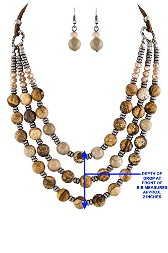 Variegated, mottled tan and medium brown faux-stone and beige irisdescent, aurora borealis finish glass bead 3 line layered bib necklace on brown faux-suede with burnished silver-tone spacer beads and silver-tone findings.The necklace measures 16 inches in length, with an additional 3 inches of wearable length available via extender chain, and the depth of drop, at the front of the necklace, measures approximately 2 inches.