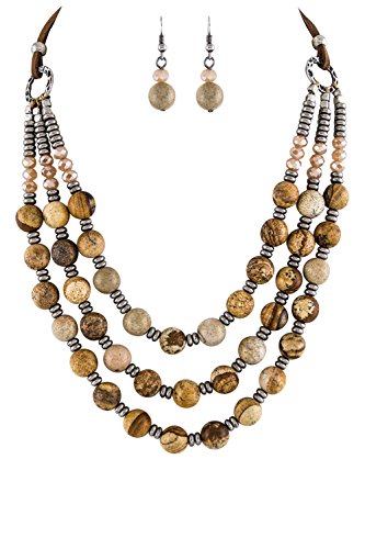 16 inch variegated, mottled tan and medium brown round faux stone and beige irisdecent aurora borealis glass bead 3 line layered bib necklace on brown faux-suede, with burnished silver-tone spacer beads and silver-tone findings. An additional 3 inches of wearable length is available via extender chain.