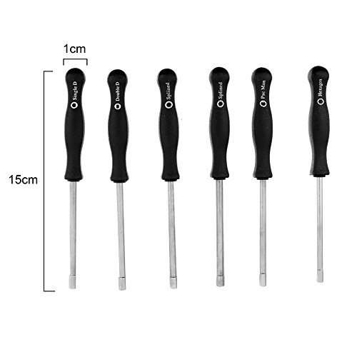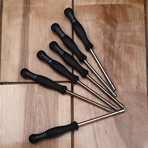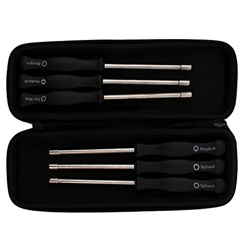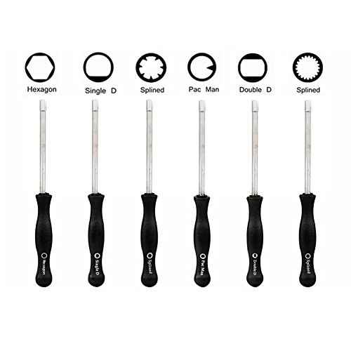 The set contains 6 different screwdrivers: a 7-Teeth Splined /21-Teeth Splined / Pac Man / Single D / Double D / Hexagon screwdriver.