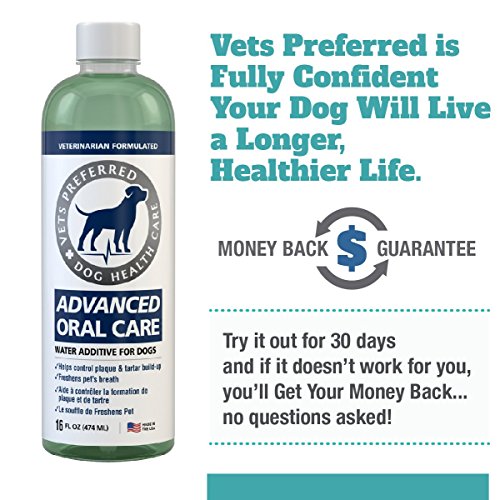 -. Feature : IT WORKS! Mild mint flavor helps fight bad dog breath does NOT have to be a problem! Ensure fresh breath, clean dog teeth AND overall dog health! (Safe for Cats) / SO EASY! Don't waste time wrestling with a dog toothbrush! Simply add a small amount of this dog breath freshener to your dog's water! Works like dog breath mints! / VETERINARIAN RECOMMENDED! Veterinarian-Grade solution for dog oral health with 100% Money Back Guarantee - Made in USA / DID YOU KNOW? Dogs don't have hands so they use their mouths for EVERYTHING! This is why dog oral care is CRITICAL for your dog health! / VERY SERIOUS ISSUE! Did you also know that plaque and tartar can cause IRREVERSIBLE gum disease? This can allow dangerous bacteria to enter their bloodstreams causing heart, liver and kidney diseases! Vet's Preferred Advanced Oral Care addresses these VERY issues!