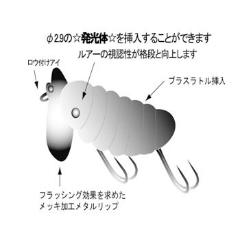 나이트 게임의 쓰기에 편리 함을 향상 시키는 시인성:시판 발광체(Φ2.9의 케미 (호타루)반디)를 삽입하는 것(일)에 의해시인성이 현격하게 오릅니다.발광체를 삽입하는 룸은,아이 부분으로 설치해 있습니다.발광체를 삽입하는 룸은,루어를 조종하는 앵글러에게서는 시인성이 좋고, 동시에 금속 립(컵)가 하방향으로 새는 빛을 차단하기 때문,대상어의 메기에게서는,발광체의 존재는 확인하여 어려운 구조가 되고 있습니다.발광체의 장착 방향은 항상 앵글러 에 대해서 최대한의 시인성을 확보함과 동시에,눈(째)시에 의한 루어 액션의 강약이 확인 가능.사용해 끝난 발광체는 매직 등에서 착색하는 것에 의해아이의 컬러를 커스터마이즈 가능.데이 게임에서 사용해 주십시오.