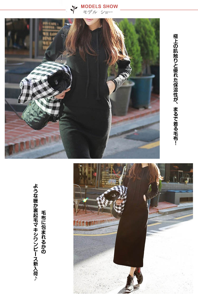 | 極上の肌触りと優れた保温性が、まるで着る毛布!毛布に包まれるかのような暖か裏起毛マキシワンピース新入荷♪表地はスウェット生地で裏地はふわふわの起毛加工になって季節感をプラス。すとんと落ちるスリムフィットタイプなので縦長効果抜群♪パーカータイプなのでこれ一枚でスタイルが完成しちゃう楽かわアイテム! | |
