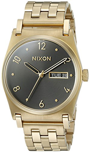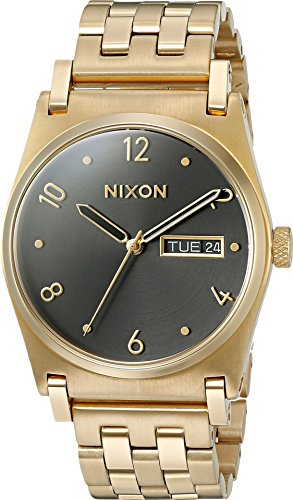 Studio : Nixon Inc. Publisher : Nixon Inc. Binding : Watch Product Description With understated ease, shape and color, for the style individualist, only the most versatile pieces will do. MOVEMENT: Miyota Japanese quartz 3 hand movement with day date feature and crown placement at 3 o'clock. DIAL: The dial features applied numbers and rivets at hour markers. Day date window at 3 o'clock. Custom molded hands and applied Nixon wordmark. CASE: 35 MM, 5 ATM custom stainless steel case with subtly domed hardened mineral crystal. Fixed SS bezel, custom solid stainless steel crown, and stainless steel screw down caseback. Free swing lugs. BAND: 18mm 5 link, custom solid stainless steel bracelet with a solid stainless steel double locking clasp with micro adjust. 0