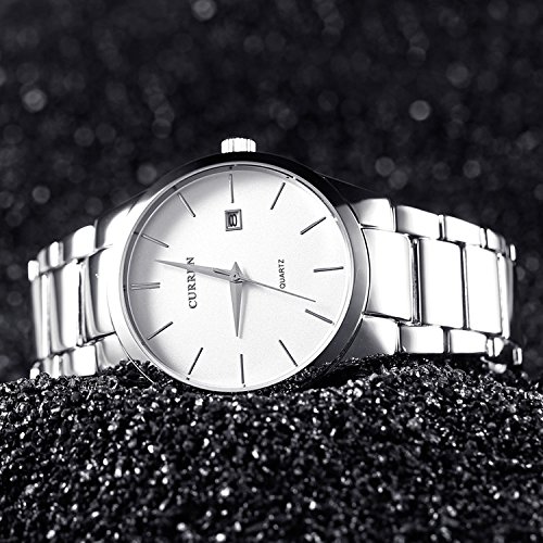 -. Title : ファッションクラシックシンプルスタイルメンズ防水時計自動日付ホワイトダイヤルシルバーメタルバンドアナログ日本クォーツムーブメント
